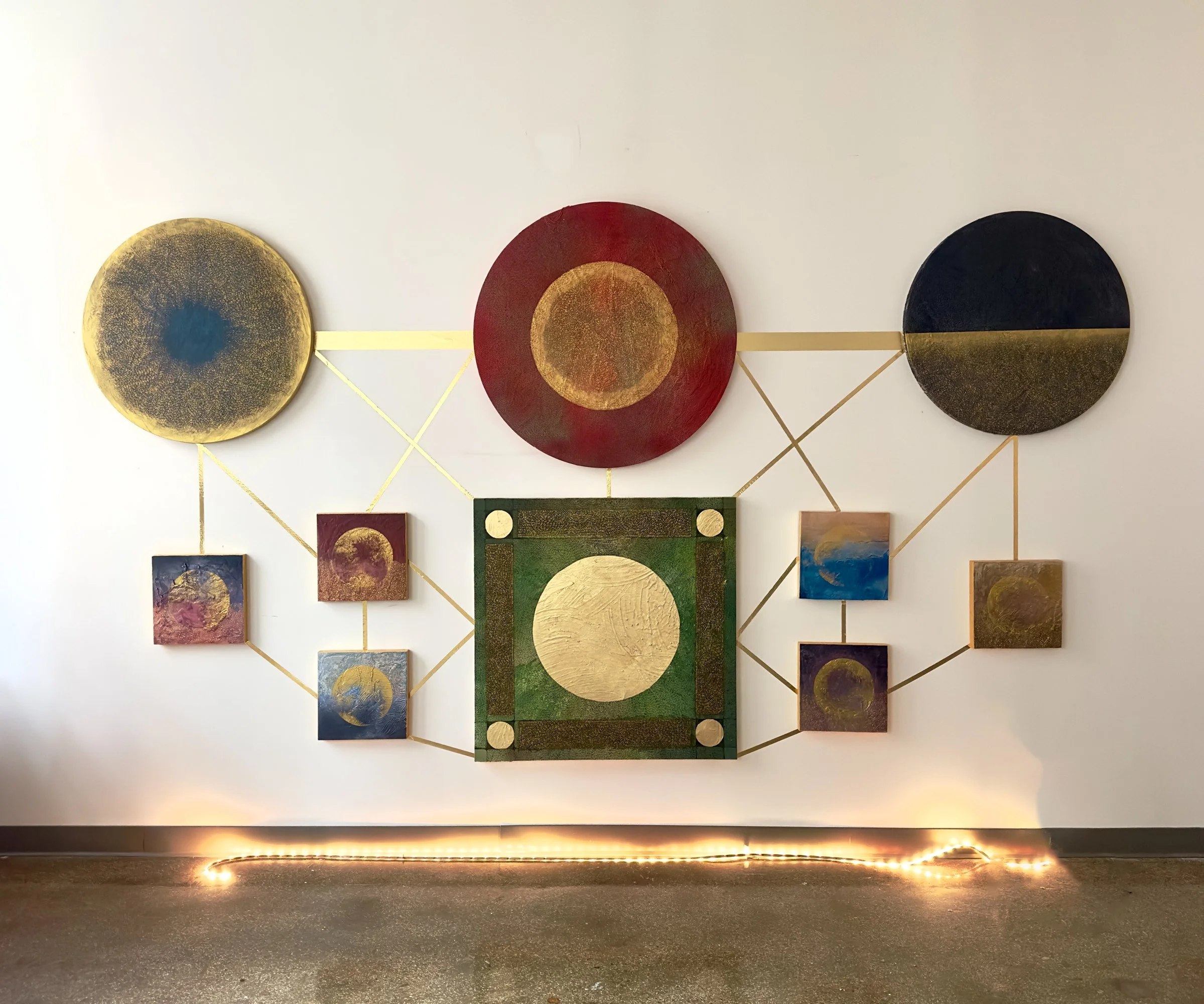 Material choices are deliberate. Spackling paste references permanence and fresco traditions. Watercolor evokes fluidity and memory. Metal leaf conducts light. Circular and hexagonal formats operate as structural containers rather than decoration. Counting becomes measurement. Repetition becomes rhythm. The surface becomes a temporal field.