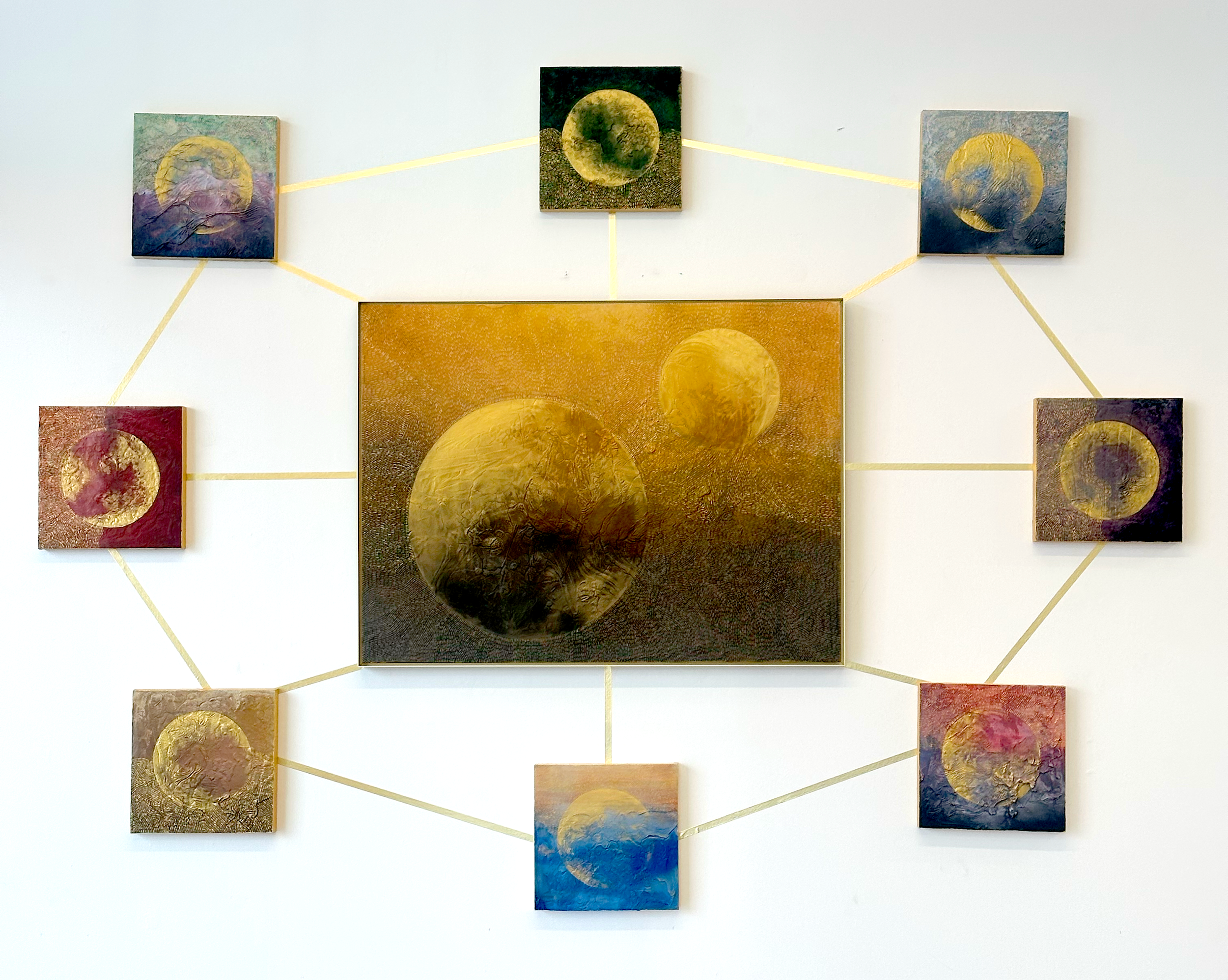 The eight surrounding paintings are planetary in essence, but not astronomically specific. These are vibrational portraits of archetypal forces that have shaped human understanding of our universe. Each planet here represents not a celestial body but a fundamental pattern of experience — communication (Mercury), love (Venus), action (Mars), expansion (Jupiter), structure (Saturn), innovation (Uranus), dreams (Neptune), grounding (Earth).