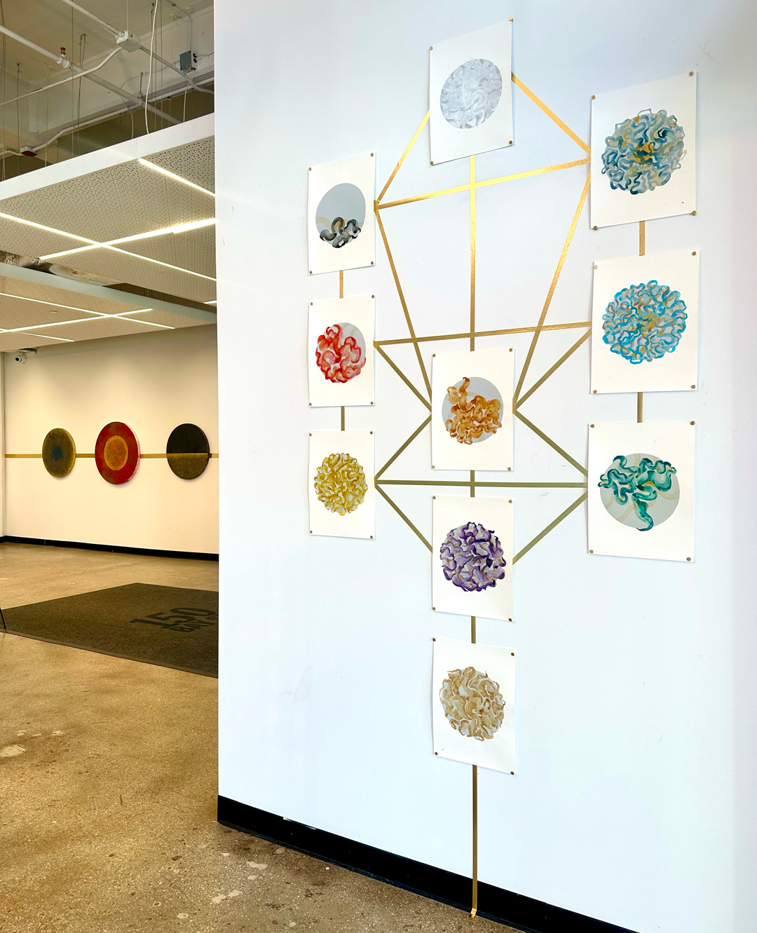 This exhibition transforms the literal threshold of our studio building into a semi-guided meditation experience. Each composition in the show is a map and a gateway at the same time. Try following the flow, count the strokes as you go, pause to reflect on how color cadence affects your mental state, pay attention to your breath and notice if it changes as you move in a circle around the room. We see the exit. We know it's there. But knowing and crossing the threshold are different things.