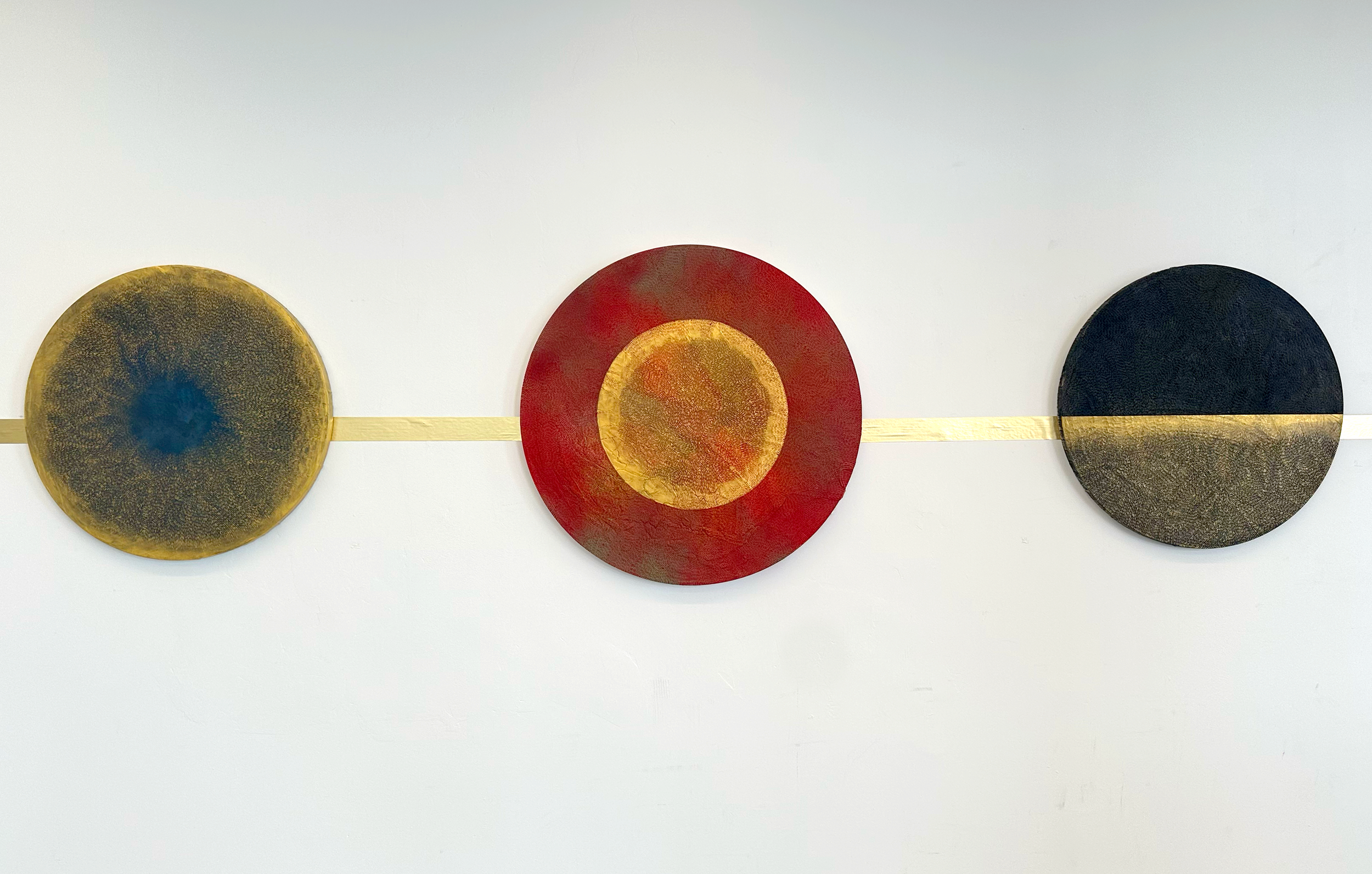 This triptych of circular paintings — The Event Horizon, The Cosmic Egg, and The Eye of Time — maps a journey through the general architecture of consciousness.