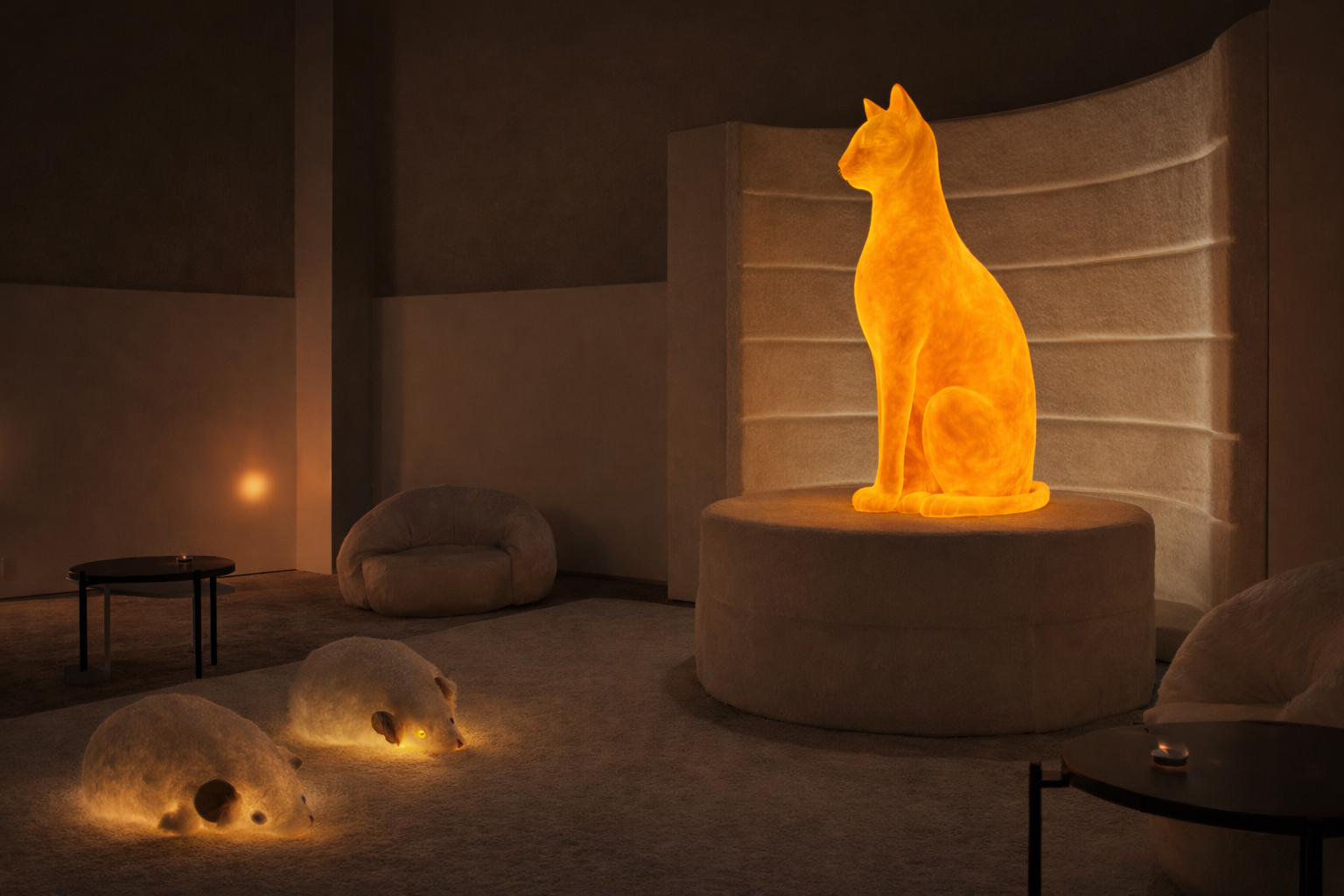 Visitors place a finger on a pulse sensor to offer their heartbeat, activating a monumental glowing cat figure inspired by Bastet. In response, the sculpture emits a synchronized purr—felt as vibration and sound—creating a brief, intimate loop between human rhythm and sculptural presence. The interaction is private, non-recorded, and lasts only as long as the visitor remains present, returning the work to stillness once the connection ends.