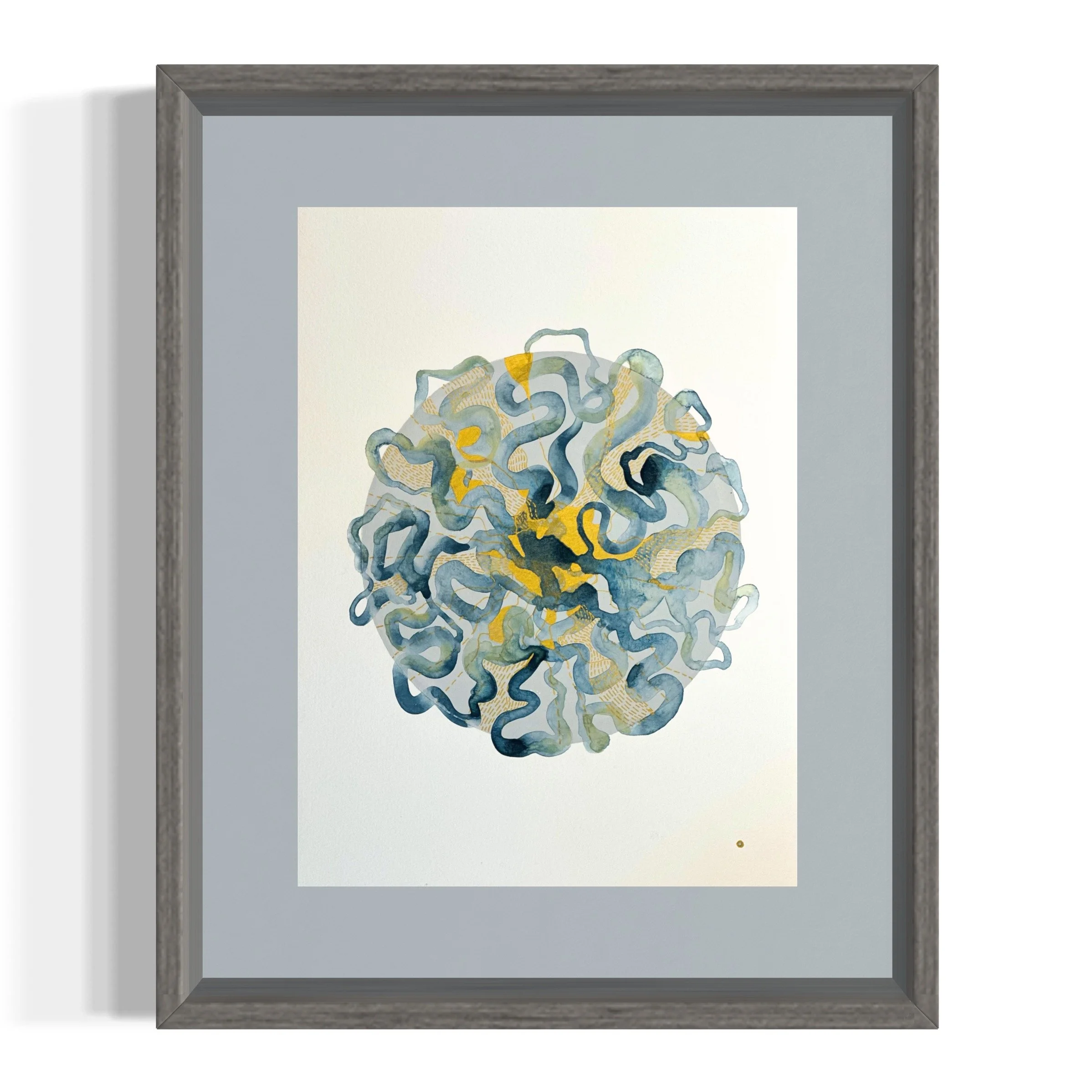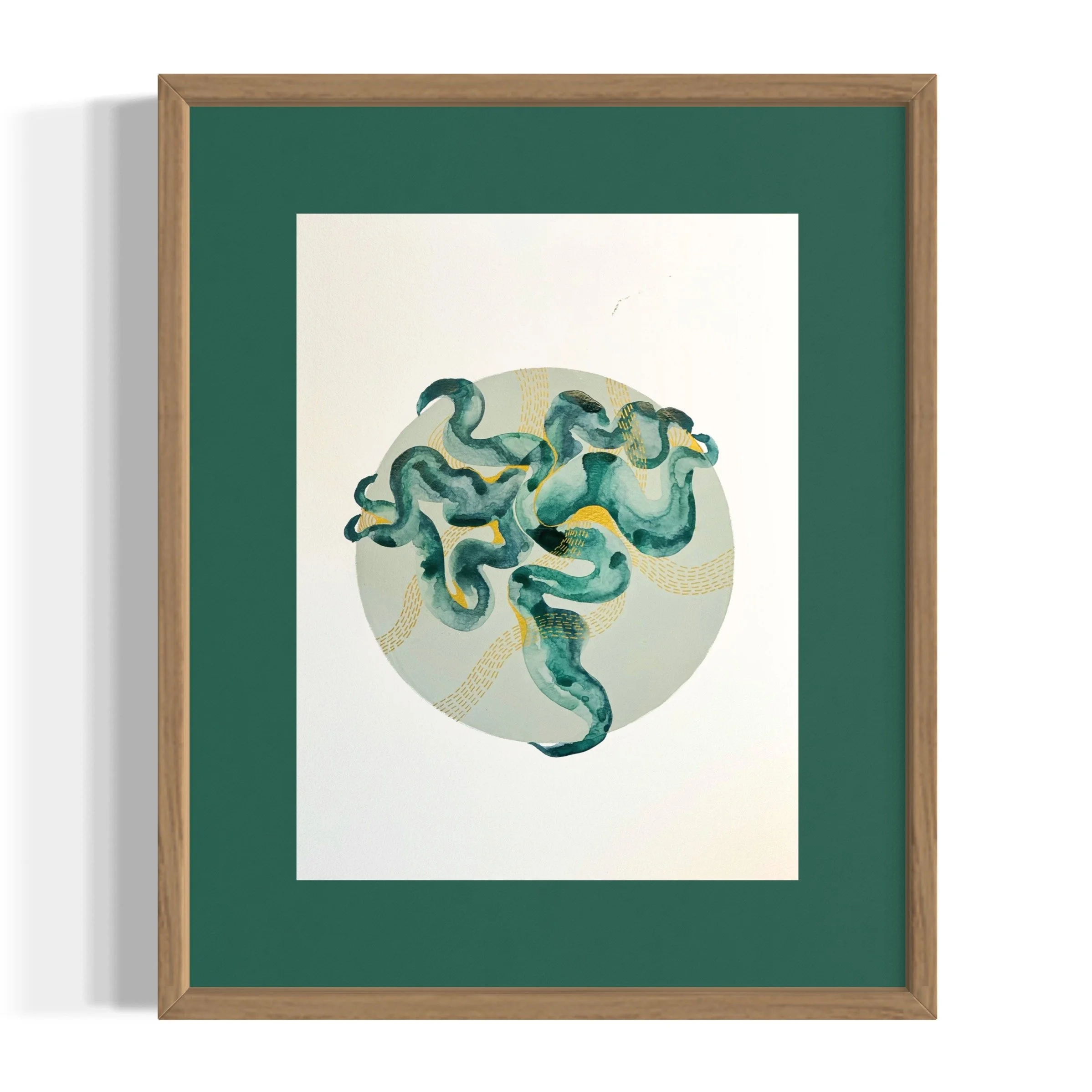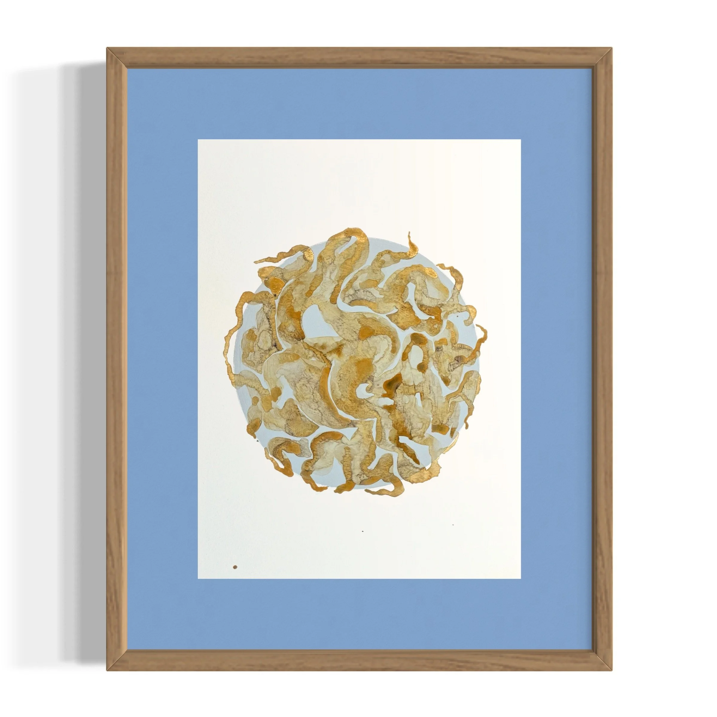 Works on paper are an exploratory genre – smaller scale allows me to experiment with new materials. Series “Snakes and Ladders” is inspired by ancient game Leela – a transformational board game of self-knowledge with roots in ancient Indian tradition. It's designed to be a game of life, offering insight into consciousness and a path to spiritual enlightenment. The game involves rolling a die, moving around a board, and interpreting the meanings of the squares to gain self-awareness and understanding of one's journey. I move the brush filled with watercolor and natural pigments on paper to create snake-like shapes while listening to singing bowls. Circular shapes create a mandala framework for the exercise and each composition reflects my mental state at the moment of painting.