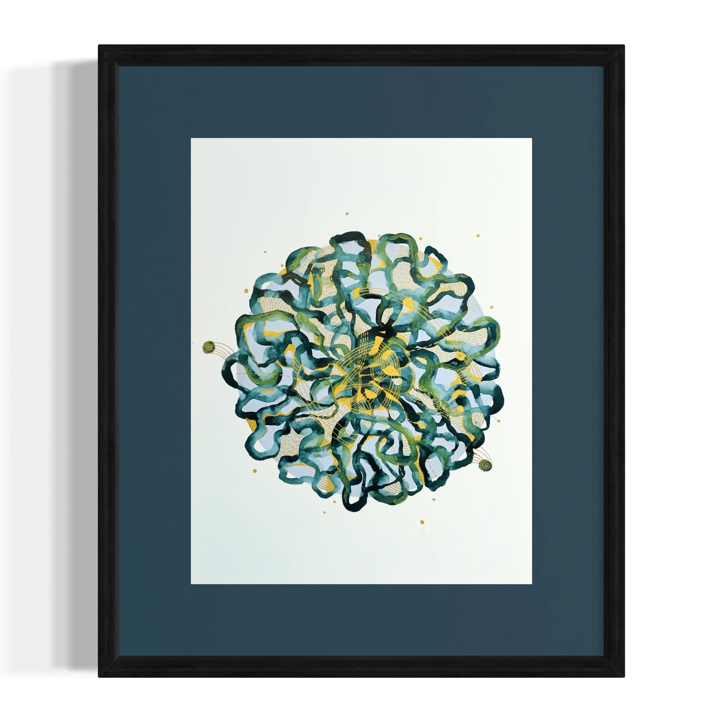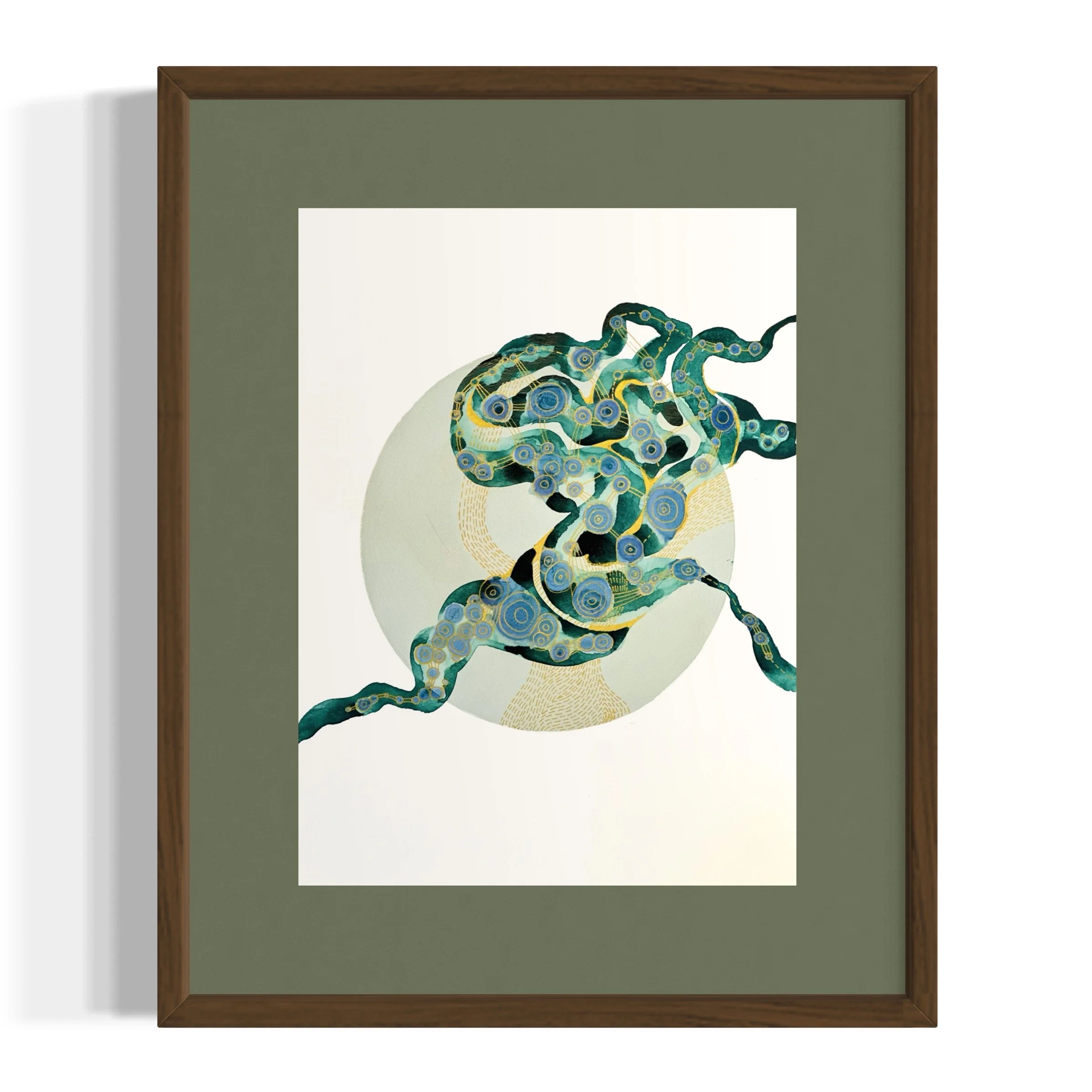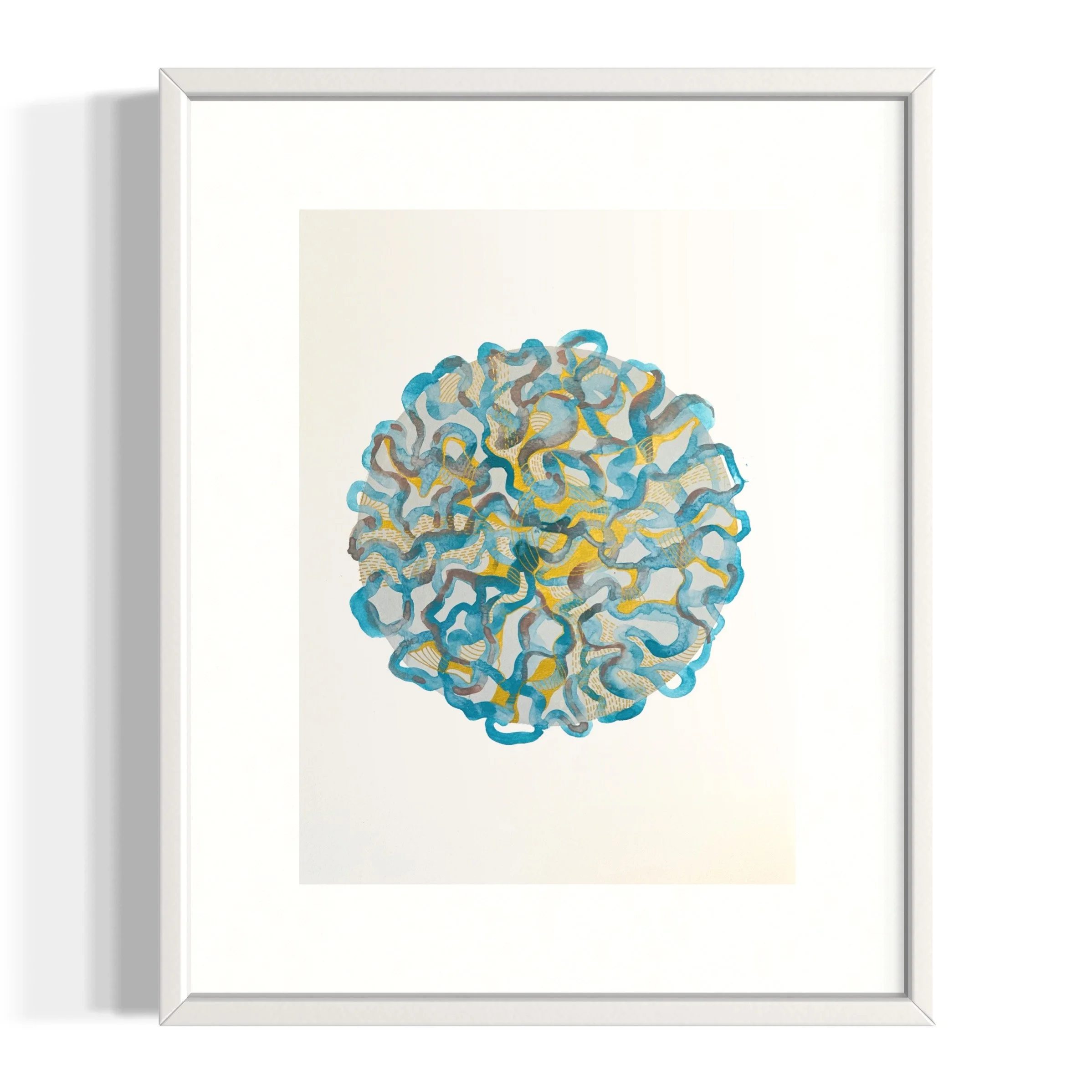 Works on paper are an exploratory genre – smaller scale allows me to experiment with new materials. Series “Snakes and Ladders” is inspired by ancient game Leela – a transformational board game of self-knowledge with roots in ancient Indian tradition. It's designed to be a game of life, offering insight into consciousness and a path to spiritual enlightenment. The game involves rolling a die, moving around a board, and interpreting the meanings of the squares to gain self-awareness and understanding of one's journey. I move the brush filled with watercolor and natural pigments on paper to create snake-like shapes while listening to singing bowls. Circular shapes create a mandala framework for the exercise and each composition reflects my mental state at the moment of painting.